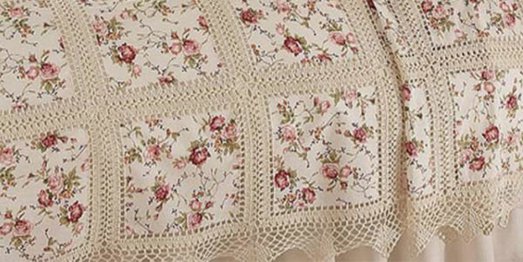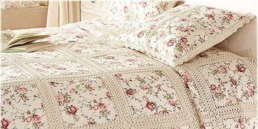 Еще одна интересная идея – сделать подобное покрывало из тканевых и вязаных квадратов, располагая их в шахматном порядке. У меня и подборка схем ажурных квадратных мотивов имеется.