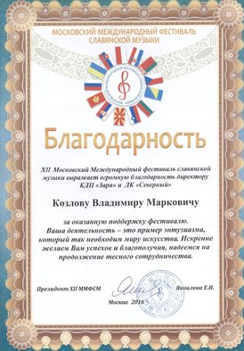 21 мая в ДК «Северный» принимал гостей из Сербии. В рамках Международного фестиваля славянской музыки, который проходит в Москве вот уже двенадцатый раз, сербский коллектив «Kud pionir», рук. Радован Молдован, привез свою концертную программу: на сцене звучала «живая» музыка народных инструментов в исполнении оркестра, сербские народные песни были поддержаны аплодисментами зрителей, а зажигательные танцы не давали усидеть на месте. Апофеозом программы стала легендарная песня «Катюша», которую подпевал весь зал.