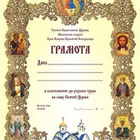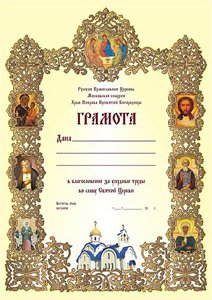 Если вам необходимо отблагодарить благотворителей, жертвователей на храм или отметить лучших работников, мы изготовим церковные грамоты, благодарственные письма с фотографией Вашего храма и с храмовыми иконами. Небольшие тиражы и цены. За пределы Петербурга высылаем почтой. Подробности на сайте: www.orthogramoty.ru