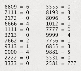 Задачка для гонконгских школьников, которая набрала «вирусную» популярность в середине 2014 года. На её решение у шестилетнего ребёнка обычно уходит не больше 20 секунд, а вот неподготовленных взрослых она часто вводит в ступор.