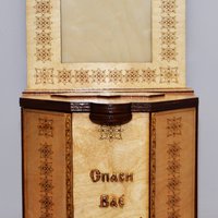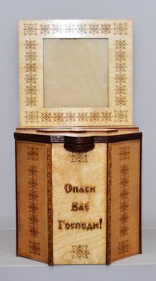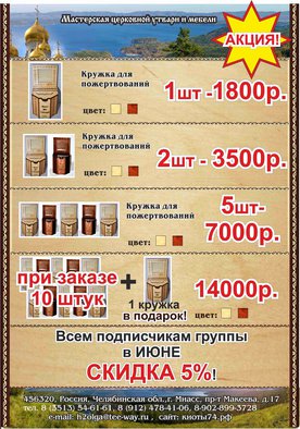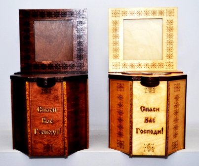 Кружка для пожертвований. Размер задней стенки 410 мм х 210 мм с двумя евроотверстиями, т.е кружка может не только ставиться, но и подвешиваться на стену. Сама кружка имеет размер 210 мм х 210 мм. На крышке кружки отверстие для пожертвований, предохраняемое с внутренней стороны небольшим кусочком бархата от возможности вытаскивания или вытряхивания денег через прорезь. На лицевой стороне кружки есть место под стеклом для записки на что жертвуются деньги. Например: "На общую свечу" и т.д. На крышку одевается навесной замок. Вес 1850 грамм. Кружка выполняется в двух цветовых решениях.