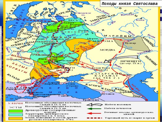 Готовя наступление на Хазарию, Святослав отверг фронтальный натиск через волго-донское междуречье и предпринял грандиозный обходной маневр. Прежде всего князь двинулся на север и покорил зависимые от каганата земли славянского племени вятичей, выведя их из зоны хазарского влияния. Перетащив ладьи из Десны на Оку, княжеская дружина поплыла по Волге, где разгромила зависимые от каганата племена волжских булгар и буртасов. Так Святослав обеспечил безопасность своего северного фланга. Хазары не ожидали удара с севера. Они были дезорганизованы подобным маневром и не смогли организовать серьезную оборону. Достигнув хазарской столицы – Итиля, Святослав атаковал пытавшееся спасти ее войско кагана и в жестокой битве разбил его. Далее киевский князь предпринял поход в Северо-Кавказский регион, где разгромил опорный пункт хазар – крепость Семендер. Во время этого похода Святослав покорил племена касогов и основал на Таманском полуострове Тмутараканское княжество. После этого дружина Святослава двинулась к Дону, где взяла штурмом и разрушила восточный хазарский форпост – крепость Саркел. Таким образом Святослав, совершив безпрецедентный поход длиной в тысячи километров, захватил основные опорные пункты хазар на Дону, Волге и Северном Кавказе. Одновременно он создал базу для славянского влияния на Северном Кавказе – Тмутараканское княжество. Эти походы сокрушили мощь Хазарского каганата, который прекратил свое существование на рубеже X–XI вв. В результате походов Святослава Древнерусское государство добилось безопасности своих юго-восточных рубежей и стало в тот период основной силой в Волжско-Каспийском регионе.