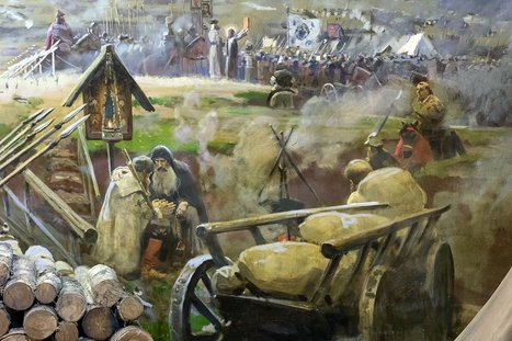Без веры не победить. Церковь сыграла решающую роль в битве. Главный, по задумке художника, герой картины – преподобный Тихон Калужский (на дальнем плане с нимбом над головой иконой в руках). Его фигура на изображении намеренно едва заметна. Роль монашеской братии Тихоновой пустыни в тех событиях едва ли не ключевая. Монахи монастыря исповедуют воинов, идущих на бой, они помогают раненым воинам, совершают отпевание почивших бойцов, а также совершают молебны перед Владимирской иконой Божией Матери.
