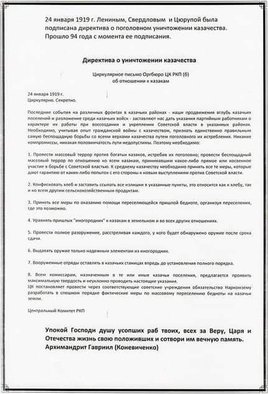 Геноцид был закреплен и одобрен законодательно директивой ВЦИК от 24 января 1919 года «Об истреблении казачества» — случай, не имевший прецедентов в российской истории.
