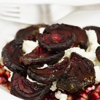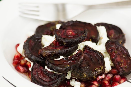 В салатницу или на тарелку уложите друг на друга зёрна граната, затем козий сыр и, напоследок, дольки запечённой свеклы.