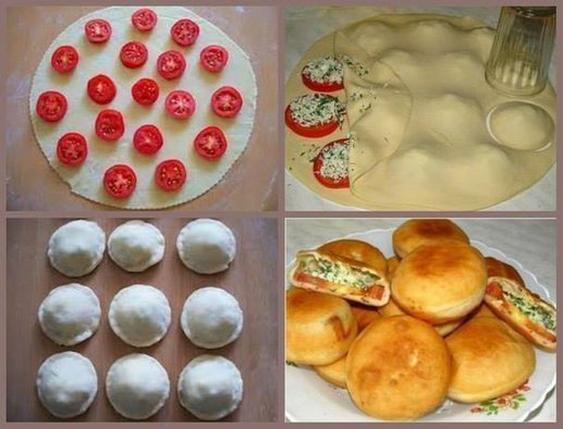 Cтаканом подходящего диаметра вырезать пирожки по контурам каждого кружочка помидора, так поступаем со всеми пирожками.