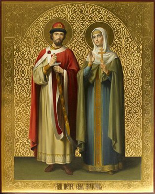 О, велицыи угодницы Божии и предивнии чудотворцы, благовернии княже Петре и княгине Февроние, града Мурома предстатели, честнаго брака хранители и о всех нас усерднии ко Господу молитвенницы! Вы во дни земнаго жития вашего образ благочестия, христианския любве и верности друг ко другу даже до гроба явили есте и тем законное и благословенное супружество прославили есте. Сего ради к вам прибегаем и молимся со усердием крепким: принесите за нас, грешных, святыя молитвы ваша ко Господу Богу, и испросите нам вся благопотребная душам и телесем нашим: веру праву, надежду благу, любовь нелицемерну, благочестие непоколебимое, в добрых делех преуспеяние, наипаче же союзом брачным сочетавшимся даруйте молитвами вашими целомудрие, друг ко другу любовь в союзе мира, единомыслие душ и телес, ложе ненаветное, пребывание незазорное, семя долгожизненное, о чадех благодать, домы исполнены благостыни и в жизни вечней неувядаемый венец славы Небесныя. Ей, чудотворцы святии! Не презрите молитв наших, со умилением вам возносимых, но будите приснии заступницы наши пред Господем и сподобите нас предстательством вашим спасение вечное получити и Царствие Небесное наследовати, да славословим неизреченное человеколюбие Отца и Сына и Святаго Духа, в Троице покланяемаго Бога, во веки веков. Аминь.