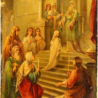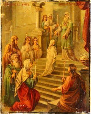 В Иерусалимский храм «благочестивые родители святые Иоаким и Анна привели маленькую трехлетнюю девочку – Ту, Которую ныне мы именуем Богоматерью. Верные собственному обету – посвятить Дочь служению Богу, – Иоаким и Анна, приведя Марию в храм, поставили Ее при входе – на первую из пятнадцати ведущих внутрь высоких и крутых ступеней. И вот маленькая Отроковица самостоятельно, без чье-либо поддержки, взойдя по этим каменным ступеням, вступила в храмовое пространство. В тот же миг навстречу Ей вышел первосвященник: по преданию, то был Захария – будущий отец Иоанна Предтечи. Он, по особому откровению Божию, взяв Откроковицу, ввел Ее во Святая Святых – в то самое место, куда даже первосвященник имел право входить лишь раз в году. После этого Иоаким и Анна вернулись в свой дом. Мария же стала жить при храме – в здании, где обитали девы, воспитываясь и учась… Предание Церкви повествует о том, что Мария прожила при храме до двенадцати лет» (Православные церковные праздники / Малков П.Ю. – М.: Издательство Сретенского монастыря, 2013, с. 57, 63–64, 59–60, 61).
