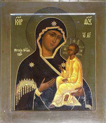 Югская икона является одним из чудотворных списков Смоленской иконы Божией Матери; иконографический тип – Одигитрия. Празднование в честь иконы 3/16 июня и 28 июля/10 августа