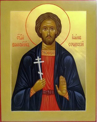 О святый угодниче Божий, великомучениче Иоанне! Подвигом добрым подвизався на земли, восприял еси на Небесех венец правды, егоже уготовал есть Господь всем любящим Его. Темже взирающе на святый твой образ, радуемся о преславнем скончании жительства твоего и чтем святую память твою. Ты же, предстоя Престолу Божию, приими моления наша и ко Всемилостивому Богу принеси, о еже простити нам всякое прегрешение и помощи нам стати противу кознем диавольским, да избавльшеся от скорбей, болезней, бед и напастей и всякаго зла, благочестно и праведно поживем в нынешнем веце, сподобимся предстательством твоим, аще и недостойни есмы, видети благая на земли живых, славяще Единаго во святых Своих славимаго Бога, Отца и Сына и Святаго Духа, ныне и присно и во веки веков. Аминь.