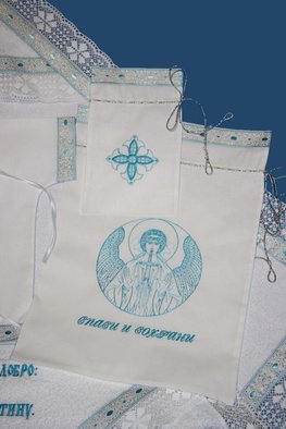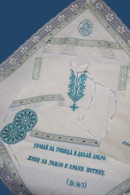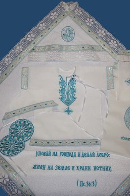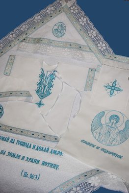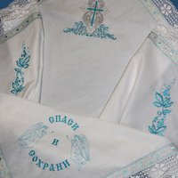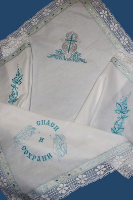 Крестильный набор из 100% хлопка с отделкой хлопковым кружевом, набор из 8 предметов: рубашка, чепчик, уголок махровый с вышивкой иконы Богородицы "Неувядаемый Цвет" и вышивкой Пс.36:3, размер уголка 100*100, пеленка размер 110*110, мешочек для волос и крестика, мешочек для хранения набора, подсвечники для крестных-2 штуки.Размеры от 56 по 86.Размер 80-86 (без чепчика) Крестильный набор "Радомир"