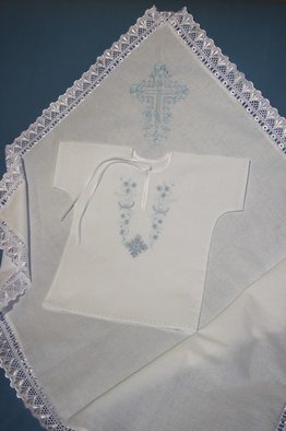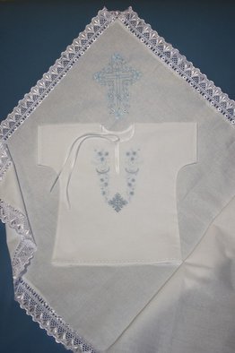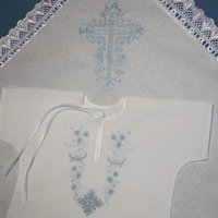 Набор из 100 % хлопка с отделкой хлопковой тесьмой "Шитье", в набор входит рубашечка и пеленочка размер 110*110.Размер от 56 по 80 Крестильный набор "Причастие"