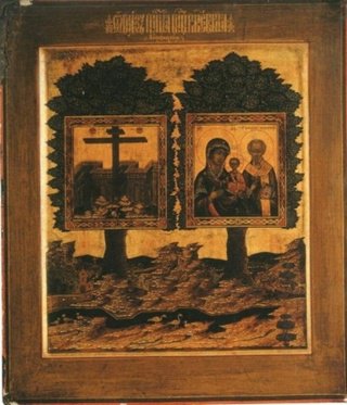 Около ста жителей окрестных деревень отправились в лес и увидели прибитый на дереве железный крест, а недалеко от него небольшую икону старинного письма. На иконе была изображена Богородица с Младенцем на руках, а по левую сторону от Неё – святитель Николай Чудотворец. Как только икону сняли с дерева, в лесу поднялся сильный шум, как бы от урагана, а над иконой появилось необычное свечение.