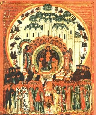У подножия трона, на котором восседает Божия Матерь с Предвечным Младенцем, изображён автор гимна – преподобный Иоанн Дамаскин, песнописец (память 17 декабря по новому стилю), в руках которого свиток с текстом гимна.