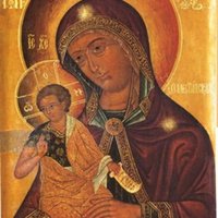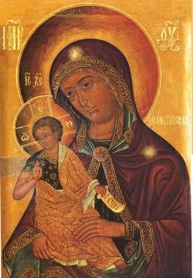 Очень редкий в древнерусской иконописи вариант изображения Пресвятой Богородицы.