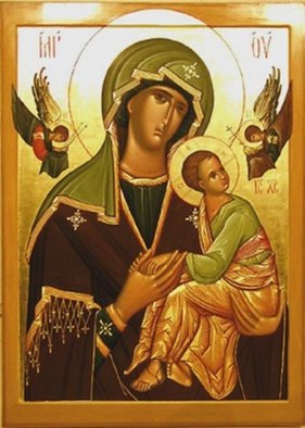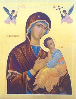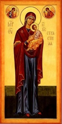 «Страстная» икона Божией Матери (Одигитрия) - чудотворная икона, представляющая собой один из иконографических вариантов Одигитрии. В углах иконы изображены летящие ангелы с орудиями страстей Христовых в руках (копие, трость, Голгофский крест), лик Богоматери склонен к Младенцу, повернувшему голову к летящему ангелу и держащемуся обеими руками за кисть правой руки Богоматери. В поствизантийское время этот иконографический тип был популярен у мастеров итало-критской школы и получил большое распространение как в Католической, так и в Православной церкви. Иконы Страстной Одигитрии появились и на Руси. В 17 веке при царе Михаиле Федоровиче прославилась чудесами Страстная икона из села Палицы в Нижегородской губернии. В 1641 ее перенесли в Москву, на месте встречи был основан Страстной монастырь, с нее делались многочисленные списки.