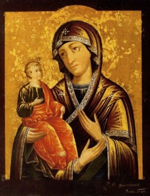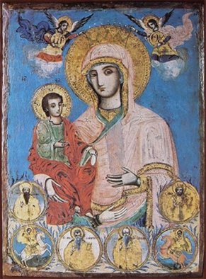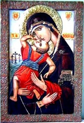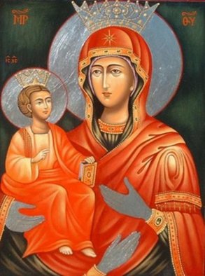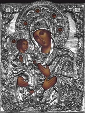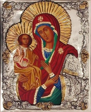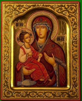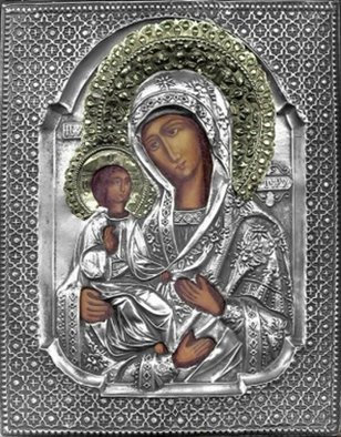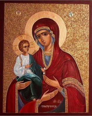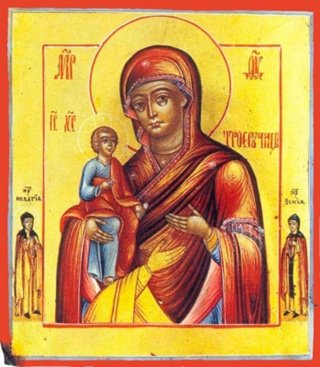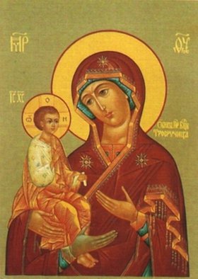 «Троеручица» - одна из самых прославленных и широко почитаемых в православном мире чудотворных икон Богоматери типа Одигитрии, святыня сербского монастыря Хиландар на Афоне. Отличается левосторонним изображением Младенца Христа (сидит на правой руке Богоматери). Согласно преданию, благодаря молитве у этого образа исцелил свою руку, отрубленную по навету врагов, защитник иконопочитания и гимнограф Иоанн Дамаскин (8 век); в благодарность он принес в дар чудотворной иконе серебряное изваяние исцеленной руки, которое было привешено к иконе (в связи с этим она получила наименование «Троеручица»). Предание связывает предысторию «Троеручицы» с Палестиной, а ее появление в Сербии — со святым архиепископом Саввой (конец 12 века); при нашествии турок икона была возложена на осла, который принес ее на Афон. В Хиландаре «Троеручица» почитается как игуменья монастыря; сохранившаяся здесь чудотворная икона датируется серединой 14 века. «Троеручица» получила широкое почитание в России с 17 века, когда были принесены с Афона ее списки (один из них — патриарху Никону для Новоиерусалимского Воскресенского монастыря); имеется ряд местночтимых русских списков «Троеручицы», на которых вотивная серебряная рука изображена красками как третья рука Богоматери.