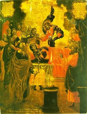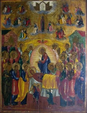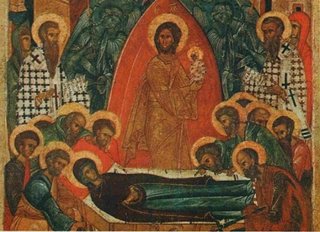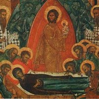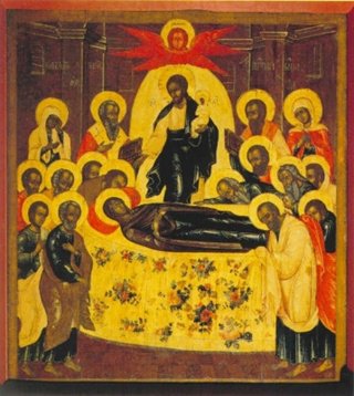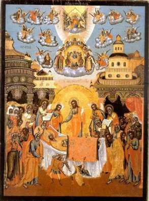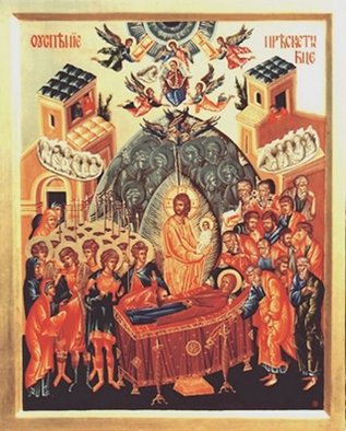 С радостью восприняла Богородица весть о скорой встрече со Своим Сыном и попросила, чтобы Господь собрал к Её кончине апостолов, проповедовавших в это время Евангелие в разных концах мира. И Христос, действительно, чудесным образом собрал апостолов ко одру, на котором возлежала готовящаяся отойти в мир иной Богородица.