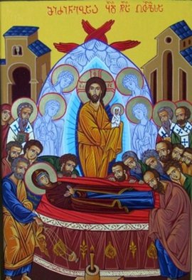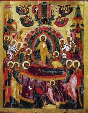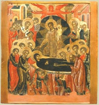 И вот все увидели, как в сиянии божественного света сошёл Христос, окружённый множеством Сил Небесных, и Пресвятая Богородица предала душу в Его руки. Пресвятая Дева была похоронена в Гефсимании. Предание рассказывает о многих чудесах, сопровождавших погребение Пресвятой Богородицы. Толпы людей следовали за Её телом, что не понравилось иудейским начальникам и священникам.