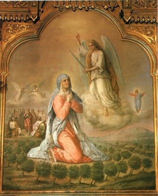 Икона посвящена двунадесятому (одному из двенадцати) празднику Успения Пресвятой Богородицы. После Вознесения Христа Божия Матерь оставалась на попечении апостола Иоанна. Часто Она приходила помолиться ко Святому Гробу Господню. В одно из таких посещений Голгофы во время молитвы пред Нею предстал Архангел Гавриил и возвестил о скором Её переселении из жизни земной в жизнь вечную.