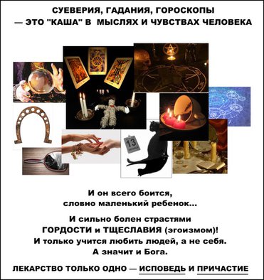 Поэтому если вы участвовали когда-то в гаданиях или верили гороскопам и всяким суевериям, идите с этим обязательно на Исповедь, а затем на Причастие. И Бог вам все простит. ВСЕ БЕЗ ИСКЛЮЧЕНИЯ. Нет никакой трагедии в том, что вы когда-то впали в это испытание от Бога. Это был Его урок вам, что так делать нельзя.