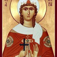 А́гнице всеблаже́нная Варва́ро,/ Боже́ственне озари́вшися Све́том Святы́я Тро́ицы Трисо́лнечным/ и в купе́ли Креще́ния утверди́вшися,/ в побежде́ние ле́сти оте́ческия,/ ве́ру испове́дала еси́ Христо́ву./ Те́мже, всечестна́я, свы́ше благода́ть тебе́ дарова́ Бог,/ исцеля́ти неду́ги и боле́зни вся.// Его́же моли́, великому́ченице, да спасе́т ду́ши на́ша.