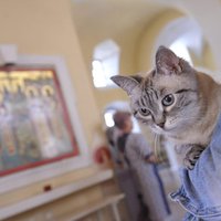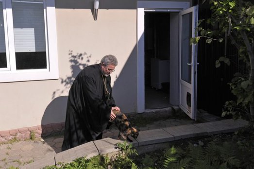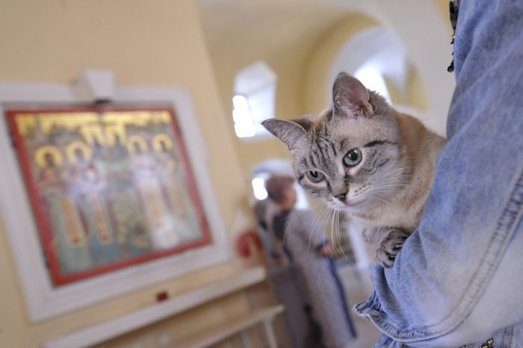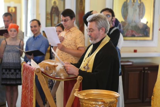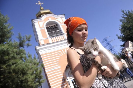 Верующие приехали на богослужение вместе со своими котами и кошками. По окончании молебна о. Петр окропил животных святой водой.