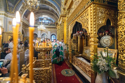 По прибытии в собор Предстоятель Русской Православной Церкви поклонился честным мощам святителя Алексия, митрополита Киевского, Московского и всея Руси.
