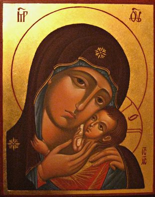 Это небольшой образ, написанный масляными красками на холсте, наклеенном на доску. Владычица и Богомладенец изображены только по верхнюю часть груди. Богоматерь со скорбными очами прижимает к щеке Своей Младенца Христа, придерживая голову Его обеими руками. Прильнув к Пречистой, Младенец левой рукой схватился за плат, покрывающий главу Приснодевы, в правой Он держит свиток.