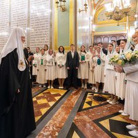 Богослужебные песнопения исполнили Патриарший хор Храма Христа Спасителя под управлением И.Б. Толкачева и Детский хор Государственного академического Большого театра России под управлением Юлии Молчановой.