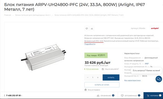 Таким образом, использование блоков питания с PFC еще более увеличивает <экологичность> светодиодных изделий. Не на всех блоках питания есть аббревиатура PFC, но определить эффективность изделия можно, посмотрев на значение индекса ?. Хороший блок питания имеет ? не менее 0, 6. Значение ? свыше 0, 9 характерно для блоков питания высокого класса.