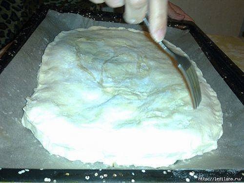 Сверху выкладываем крем, разравниваем сверху накрываем вторым пластом, концы которого подворачиваем под первый на 2-3 см и проткнем в нескольких местах вилкой.