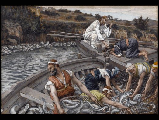 «Когда же перестал учить, – говорит Евангелист, – сказал Симону: отплыви на глубину и закиньте сети свои для лова, Симон сказал Ему в ответ: Наставник! мы трудились всю ночь и ничего не поймали, но по слову Твоему закину сеть. Сделав это, они поймали великое множество рыбы, и даже сеть у них прорывалась. И дали знак товарищам, находившимся на другой лодке, чтобы пришли помочь им; и пришли, и наполнили обе лодки, так что они начинали тонуть. Увидев это, Симон Петр припал к коленям Иисуса и сказал: «выйди от меня, Господи! Потому что я человек грешный. Ибо ужас объял его и всех, бывших с ним, от этого лова рыб...».