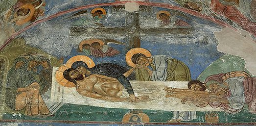 Святое тело Господне Иосиф, сняв с древа, погребает в новом гробу и в вертограде, над входом гроба полагает весьма великий камень. Отселе ад содрогается и изумляется, ощутив могущественнейшую силу; и в скором времени он, неправедно поглотивший, изрыгает и Христа, — твердейший и краеугольный камень, — и тех, которых заключал во чреве своем, как снедь и наслаждение для себя. «Разрешения в стихии, из которых составлено, и исчезновения не потерпело тело Господа», — говорит св. Иоанн Дамаскин.