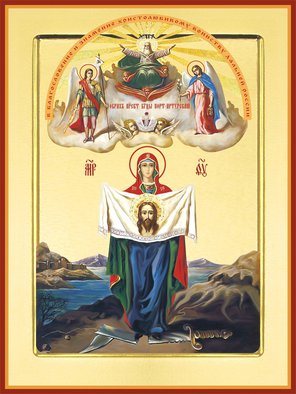 С правой стороны от Богородицы был Архистратиг Михаил, с левой – Архангел Гавриил. Над головой Пресвятой Богородицы ангелы держали царскую корону, увенчанную перекрещивающимися радугами с крестом наверху. Еще выше были изображены Бесплотные Силы и Господь Саваоф.