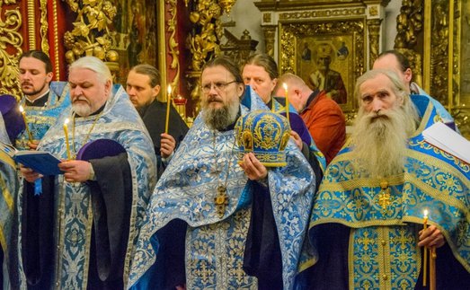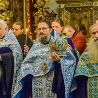 14 марта (среда) 2018 г. Накануне дня прославления иконы Пресвятой Богородицы Державная и 25-летия своего служения на Псковской кафедре, настоятель псковского воинского храма святого благоверного великого князя Александра Невского митрофорный протоиерей Олег Тэор сослужил митрополиту Псковскому и Порховский Евсевию праздничную Утреню с чтением акафиста Пресвятой Богородице в Свято-Троицком кафедральном соборе.