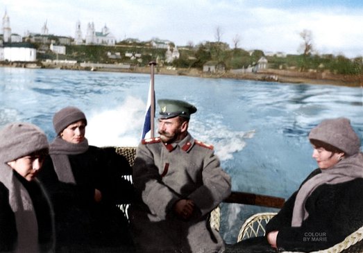Августѣйшiя Дѣти Ихъ Императорскихъ Величествъ. Ихъ Императорскiя Высочества Великiя Княжны Татiана Николаевна, Марiя Николаевна и Анастасiя Николаевна на прогулкѣ на моторномъ катерѣ по рѣкѣ Днѣпръ въ окрестности Могилева, Могилевская губернія, августъ 1916 года.