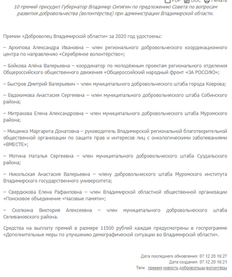 Подведены итоги присуждения ежегодной премии "Доброволец Владимирской области"