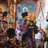 Во вре́мя о́но, поя́т Иису́с обана́десять, нача́т им глаго́лати, я́же хотя́ху Ему́ бы́ти, я́ко се восхо́дим во Иерусали́м, и Сын Челове́ческий пре́дан бу́дет архиере́ом и кни́жником, и осу́дят Его́ на смерть, и предадя́т Его́ язы́ком, и поруга́ются Ему́, и уя́звят Его́, и оплю́ют Его́, и убию́т Его́, и в тре́тий день воскре́снет. И пред Ним приидо́ста Иа́ков и Иоа́нн, сы́на Зеведе́ева, глаго́люща: Учи́телю, хо́щева, да, е́же а́ще про́сива, сотвори́ши на́ма. Он же рече́ и́ма: что хо́щета, да сотворю́ ва́ма? Она́ же ре́ста Ему́: даждь нам, да еди́н одесну́ю Тебе́ и еди́н ошу́юю Тебе́ ся́дева во сла́ве Твое́й. Иису́с же рече́ и́ма: не ве́стася, чесо́ про́сита. Мо́жета ли пи́ти ча́шу, ю́же Аз пию́, и креще́нием, и́мже Аз креща́юся, крести́тися? Она́ же ре́ста Ему́: мо́жева. Иису́с же рече́ и́ма: ча́шу у́бо, ю́же Аз пию́, испие́та, и креще́нием, и́мже Аз креща́юся, крести́тася, а е́же се́сти одесну́ю Мене́ и ошу́юю, несть Мне да́ти, но и́мже угото́вано есть. И слы́шавше де́сять, нача́ша негодова́ти о Иа́кове и Иоа́нне. Иису́с же призва́в их, глаго́ла им: ве́сте, я́ко мня́щиися владе́ти язы́ки, соодолева́ют им, и вели́цыи их облада́ют и́ми. Не та́ко же бу́дет в вас, но и́же а́ще хо́щет в вас вя́щший бы́ти, да бу́дет вам слуга́, и и́же а́ще хо́щет в вас бы́ти ста́рей, да бу́дет всем раб. И́бо Сын Челове́чь не прии́де, да послу́жат Ему́, но да послу́жит и да́ти ду́шу Свою́ избавле́ние за мно́ги.