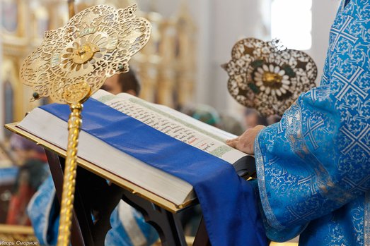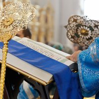 Во днех о́нех зача́т Eлисаве́т, жена́ Заха́риина, и тая́шеся ме́сяц пять, глаго́лющи: я́ко та́ко мне сотвори́ Госпо́дь во дни, в ня́же призре́ отъя́ти поноше́ние мое́ в челове́цех. В ме́сяц же шесты́й по́слан бысть А́нгел Гаврии́л от Бо́га во град Галиле́йский, eму́же и́мя Назаре́т, к Де́ве обруче́нней му́жеви, eму́же и́мя Ио́сиф, от до́му Дави́дова, и и́мя Де́ве, Мариа́м. И вшед к Ней А́нгел, рече́: ра́дуйся Благода́тная, Госпо́дь с Тобо́ю, благослове́на Ты в жена́х. Oна́ же ви́девши смути́ся о словеси́ eго́, и помышля́ше, каково́ бу́дет целова́ние сие́. И рече́ А́нгел Eй: не бо́йся Мариа́м, обре́те бо благода́ть от Бо́га. И се зачне́ши во чре́ве, и роди́ши Сы́на, и нарече́ши и́мя Eму́ Иису́с. Сей бу́дет ве́лий, и Сын Вы́шняго нарече́тся, и даст Eму́ Госпо́дь Бог престо́л Дави́да oтца́ Eго́, и воцари́тся в дому́ Иа́ковли во ве́ки, и Ца́рствию Eго́ не бу́дет конца́. Рече́ же Мариа́м ко А́нгелу: ка́ко бу́дет сие́, иде́же му́жа не зна́ю? И отвеща́в А́нгел, рече́ Eй: Дух Святы́й на́йдет на Тя, и си́ла Вы́шняго осени́т Тя, те́мже и ражда́емое Свя́то, нарече́тся Сын Бо́жий. И се Eлисаве́т, ю́жика Твоя́, и та зача́т сы́на в ста́рости свое́й, и сей ме́сяц шесты́й eсть eй, нарица́емей непло́ды. Я́ко не изнемо́жет от Бо́га всяк глаго́л. Рече́ же Мариа́м: се раба́ Госпо́дня, бу́ди Мне по глаго́лу твоему́. И оты́де от Нея́ А́нгел.