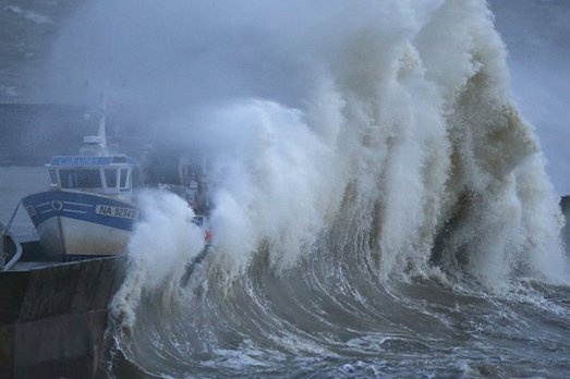 На фото: Волны во время шторма в рыбацкой гавани во Франции.