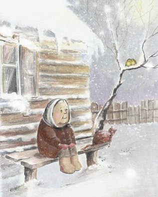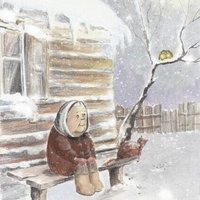 А кошка Мурка греет ей коленки,