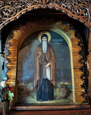 Возгоре́вся раче́нием го́рним, же́стость пусты́ни Иорда́новы па́че всех ми́ра сла́дких предпоче́л еси́; отону́дуже повину́ся тебе́ зверь да́же до сме́рти, о́тче, послу́шне и жа́лостне на гро́бе твое́м сконча́ся, просла́вльшу тя та́ко Бо́гу, к Нему́же моля́ся, и о нас, о́тче Гера́симе, помина́й.