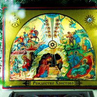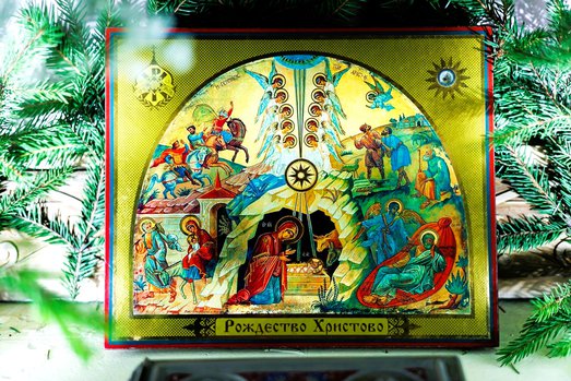 Рождество́ Твое́, Христе́ Бо́же наш, возсия́ ми́рови свет ра́зума, в нем бо звезда́м служа́щии звездо́ю уча́хуся Тебе́ кла́нятися, Со́лнцу Пра́вды, и Тебе́ ве́дети с высоты́ Восто́ка. Го́споди, сла́ва Тебе́!