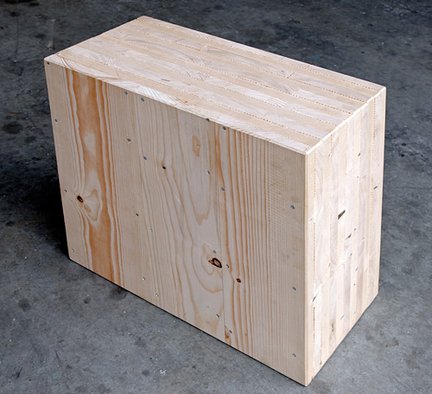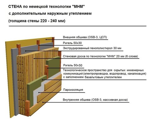 Технология Massiv-Holz-Mauer (MHM) родом из Германии. В MHM также используются слои из ламелей, перекрестно уложенных слоями. Вот только соединяются ламели между собой не с помощью клея, как в технологии CLT, а алюминиевыми штифтами. Доски после сушки проходят механическую обработку, в ходе которой у них выбирается четверть по кромке, чтобы между досок не было щелей, а на верхней плоскости фрезеруются продольные бороздки для создания дополнительной воздушной прослойки. Специальный станок формирует из обработанных таким образом досок щиты, укладывая доски в каждом следующем слое перпендикулярно предыдущему и сбивая алюминиевыми гвоздями. Алюминиевые гвозди используются потому, что алюминий является относительно мягким металлом, что позволяет в дальнейшем вырезать в панелях оконные и дверные проемы, формировать кабель-каналы и шлифовать их поверхность без ущерба для режущего инструмента станков и деформации древесины в месте установки гвоздя.