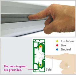 При обращении с электрическими приборами огромное значение имеет безопасность и защищённость. Все розетки и электрисеские профили Eubiq имеют высокую степень электро и влагозащищённости так как оборудованны системой GSS (заземленный затвор). Система является запатентованной функцией безопасности во всех энергетических дорожках и розетках Eubiq. Она является основанием всех токопроводящих предметов, которые вступают в контакт с трассой питания, что делает практически невозможным поражение элекрическим током. Все розетки и профили можно устанавливать вблизи раковин и зон готовки, а так же в ванных комнатах.