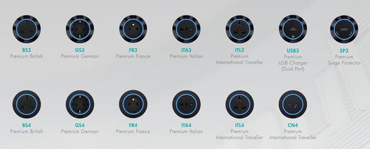Система может быть укомплектованна блоками-розетками любых стандартов и типов, выполненных как в пластиковом так и в аллюминевом корпусе со светодиодной подсветкой.