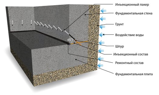 В зависимости от плотности бетона и поставленной цели определяется тип состава инъекционного раствора. При этом введение инъекционных полимеров может проводиться непосредственно в тело конструкции здания, а также в швы, трещины в фундаменте. При необходимости раствор подаётся и за конструкцию сооружения, тем самым создаётся защитный экран. Если делать полную гидроизоляцию объекта, то потребуется большое количество раствора. Более экономичным будет заполнение им только трещин и швов. Однако возможность этого должны определить специалисты.