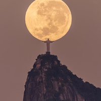 Снимок сделан бразильским фотографом Леонардо Сенсом 4 июня 2023 года. Чтобы добиться совпадения размеров совсем небольшой на небе Луны и колоссальной 98-футовой статуи, ему пришлось делать фотографию с расстояния более 10 км — такой маленькой должна была выглядеть статуя.