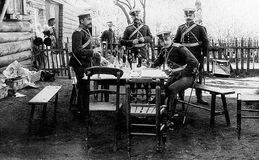 Я с газетой в руках, полной нерадостных известий, сидел в березках под крыльцом, на котором несколько приятелей по маленькой резались в преферанс. В предчувствии хорошего ужина, обильного шампанского и в качестве веселого номера застольной речи командира бригады, мы все, как манны небесной, ждали освежающей грозы. Она разразилась лишь к вечеру, но зато со страшною силою. Потопный ливень закончился злым градом, сразу же превратившим летний день в позднюю осень. К восьми часам вечера мы шли в собрание по совершенно размытым дорожкам. Моросил унылый дождик. Мой штабс-капитан был счастлив: из своей провинции он вывез убеждение, что забористо и «с пользой для организма» можно пить только холодными, дождливыми вечерами.